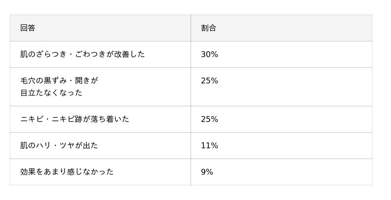 ケミカルピーリングを受けて、「肌のざらつきやごわつきが改善した」「毛穴の黒ずみや開きが目立たなくなった」「ニキビやニキビ跡が落ち着いた」といった回答がそれぞれ多く寄せられました。個々の肌悩みに応じた効果が実感できていることがうかがえます。