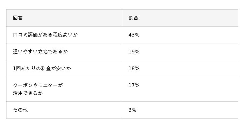 クリニック選びで「口コミ評価の高さ」を重視する人は約半数程度にのぼることが分かりました。また、ケミカルピーリングは複数回の施術が効果的であるため、通いやすさを重視する意見も多く見られました。