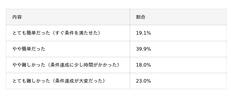 ・キャンペーンの達成難易度については、「やや簡単だった」(39.9%)が最多。一方、「やや難しかった」「とても難しかった」と回答した人は合計41.0%となり、条件達成に負担を感じた層も一定数いることが明らかになった。
