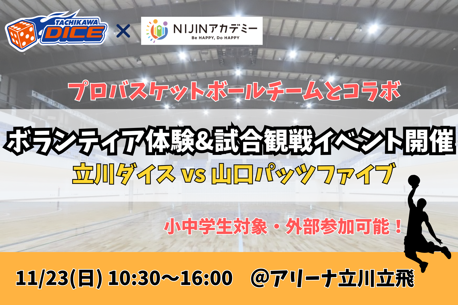 株式会社NIJIN(本社:東京都江東区、代表取締役:星野達郎)が運営する不登校オルタナティブスクール『NIJINアカデミー』は、立川市を拠点とするプロバスケットボールチーム『TACHIKAWA DICE』と連携し、不登校の子どもたちが試合運営ボランティアとして参加するキャリア体験イベントを、2025年11月23日(日)にアリーナ立川立飛で開催します。