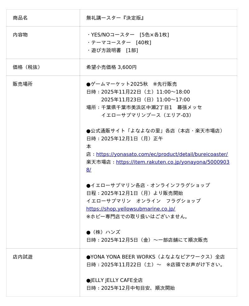 株式会社ヤッホーブルーイング(長野県軽井沢町)は、コースター型トークゲーム「無礼講ースター(ぶれいこーすたー)」を、新テーマを追加した『決定版』として2025年12月1日(月)より通年販売を開始します。「無礼講ースター」は相手の意外な一面を引き出しフラットな飲み会を実現するために2018年に開発したコースター型トークゲームで、2018年・2019年に数量限定で販売しました。商品の終売後も再販のご要望をいただいたことや、近年出社回帰の流れで、リアルでのコミュニケーションの重要性が見直されてきたことから、再販を決定。新たに10個のトークテーマを追加、旧トークテーマも時代に合わせてブラッシュアップし、『決定版』として販売いたします。