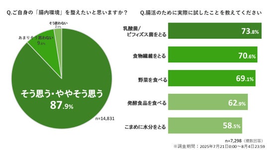 「腸内環境を整えようと思っていますか?」という質問に対して、「そう思う」「ややそう思う」と回答したユーザーは87.9%とかなり多く、腸活への関心の高さがうかがえます。さらに、具体的な腸活の取り組み内容では「乳酸菌やビフィズス菌の摂取」と回答した人が73.8%と最も多く、続いて「食物繊維の摂取」(70.6%)「野菜を食べる」(69.1%)と回答した人はどちらも7割前後という結果となり、近年の腸活ブームや健康意識の高まりを受け、日々の食生活を通じて腸活に取り組む人が増加していることがわかりました。