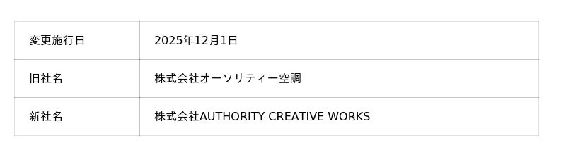 株式会社オーソリティー空調(本社:神奈川県川崎市多摩区、代表取締役:立花信一)は、2025年12月1日付で社名を「株式会社AUTHORITY CREATIVE WORKS」に変更いたしますので、お知らせいたします。