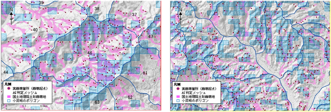 AI解析による崩壊判定結果(青枠)と実際の崩壊箇所(赤ポイント)の対応を示した図