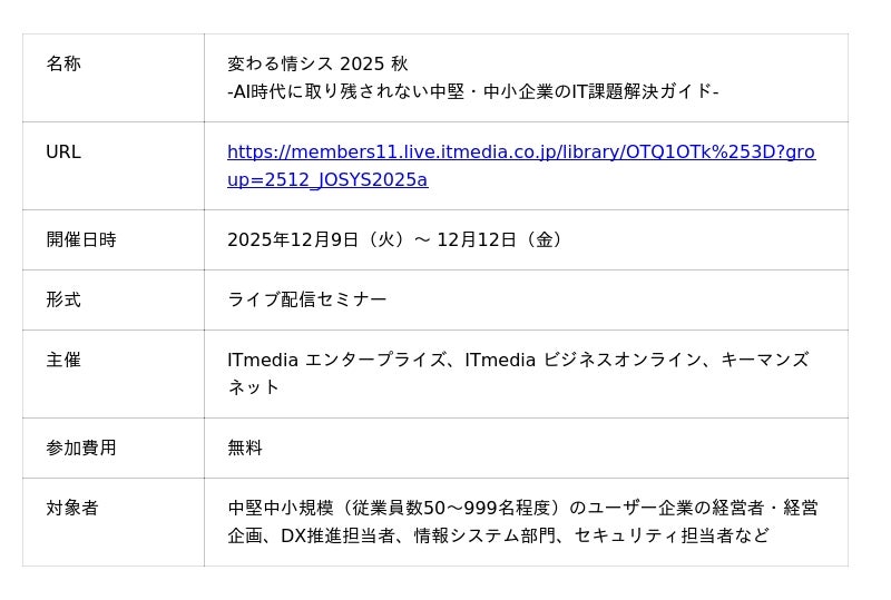 アイティメディア株式会社(本社:東京都千代田区、代表取締役社長 兼 CEO:小林教至、以下アイティメディア)は、2025年12月9日(火)~12月12日(金)に「変わる情シス 2025 秋」を開催します。本イベントは「ITmedia エンタープライズ」「ITmedia ビジネスオンライン」「キーマンズネット」の3媒体が主催するデジタルイベントで、情報システム部門の担当者や中堅中小企業の経営者などに向けて、AIを定着させるための手法やセキュリティ強化をはじめとした環境整備などについて、先進企業の事例や専門家の実践的なアドバイスを交えてお伝えします。