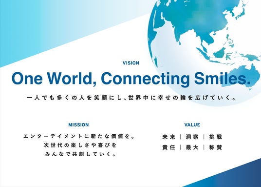 表紙には、「One World, Connecting Smiles.」というビジョンを掲げました。サンリオはこのビジョンを胸に、一人一人の笑顔を作り出し、幸せの輪を広げていくことによって「みんななかよく」という企業理念の実現を目指しています。