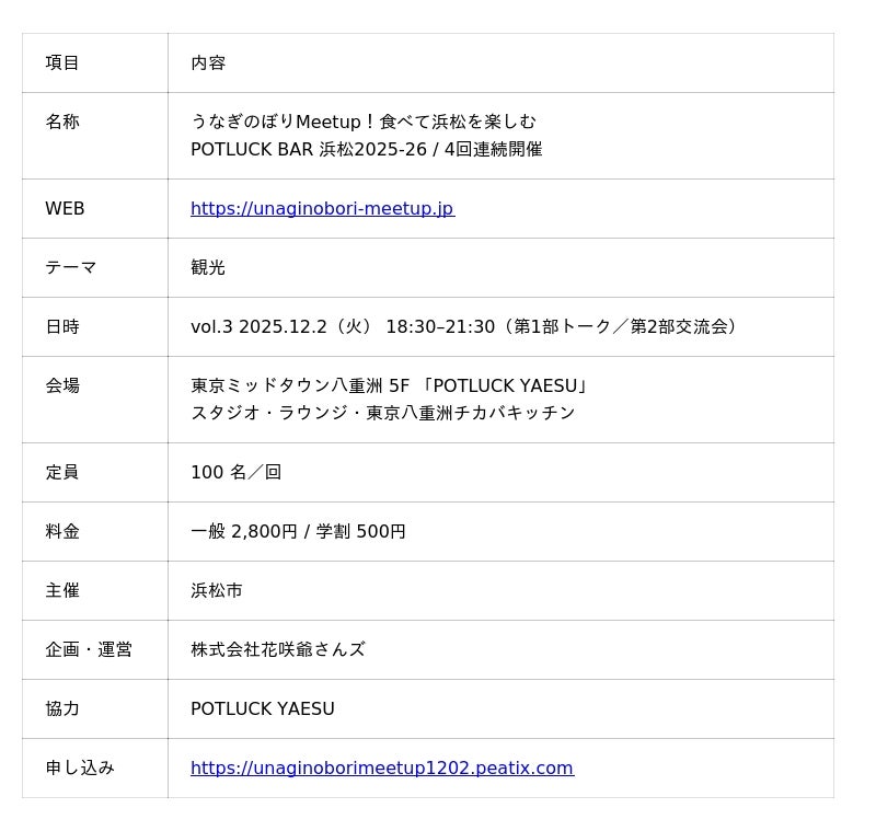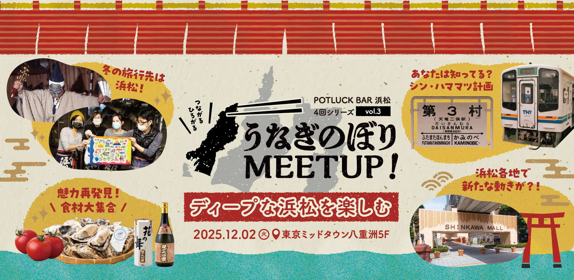 浜松市観光・シティプロモーション課は、東京・八重洲にて、浜松の旬を味わいながら交流する全4回の企画『食べて浜松を楽しむ うなぎのぼりMEETUP!POTLUCK BAR 浜松2025-26』を開催しています。
