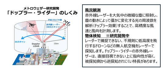 ドップラー・ライダーとは、大気中の微細な塵に人体に無害な赤外線レーザーを照射し、その反射波を受信することで、三次元で最大半径15kmの風況を観測します。 現在は風況観測に加え、ドップラー・ライダーの技術を活用した物体検知技術を研究開発しており、さらなる小型高性能化を目指しております。