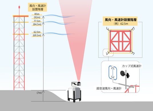ドップラー・ライダーの研究や製品開発に加え、量産化における適合性確認や事業性評価については、事前に行う精度検証が重要となります。そこで、鉄塔3箇所にIEC61400-12-1規格のカップ式風速計に加えて、カップ式よりも風向・風速をより細かい精度で観測できる超音波風向・風速計を設置して風況を計測し、ドップラー・ライダーの観測値との比較検証を行います。これは、IEC61400-12-1の公的な認証が取れる精度検証であり、世界レベルよりも高い精度での検証を行います。