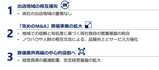 次に、当社グループをご利用いただくお客様へのメリットですが、当社は福島県を中心とした東日本4県に展開しております。一方、燦ホールディングス様は関西、関東を中心に全国16都道府県に展開されております。本経営統合により、人財の交流はもとより、ライフエンディングサポートやエンバーミング、ご遺族様のグリーフケアといったノウハウを共有いただき、活かすことで、当社グループをご利用いただくお客様により高品質なサービスのご提供ができると認識しております。また、両グループのノウハウを交流させることで、新しいサービスを創造し、多くのお客様にご提供できると認識しております。
