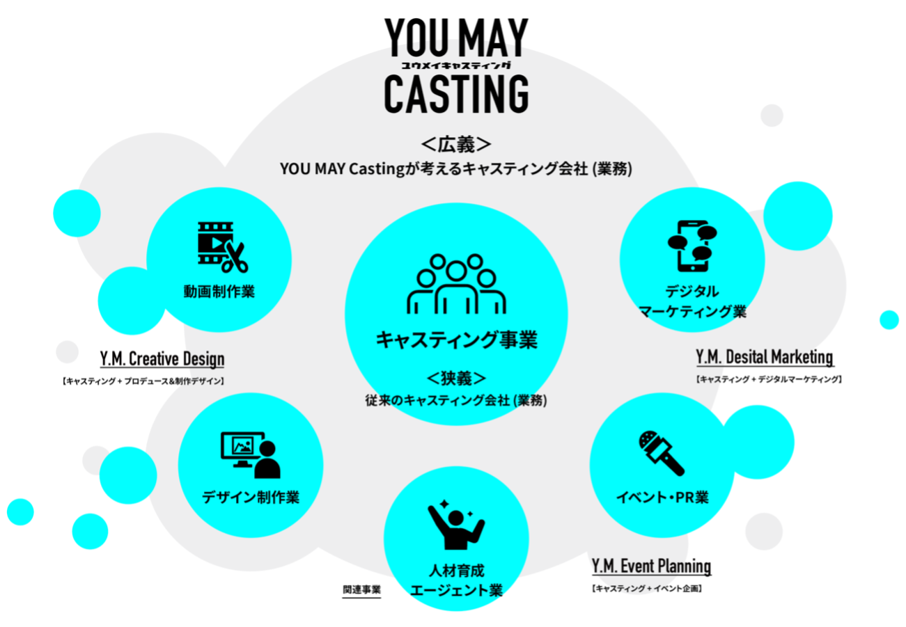 事業内容:キャスティング事業(YOU MAY Casting/aModel commune)、制作事業、発掘・育成・支援事業(AZUKARI/モデルインストラクター協会/p.m.design)、タレントエージェント事業、スタジオ事業