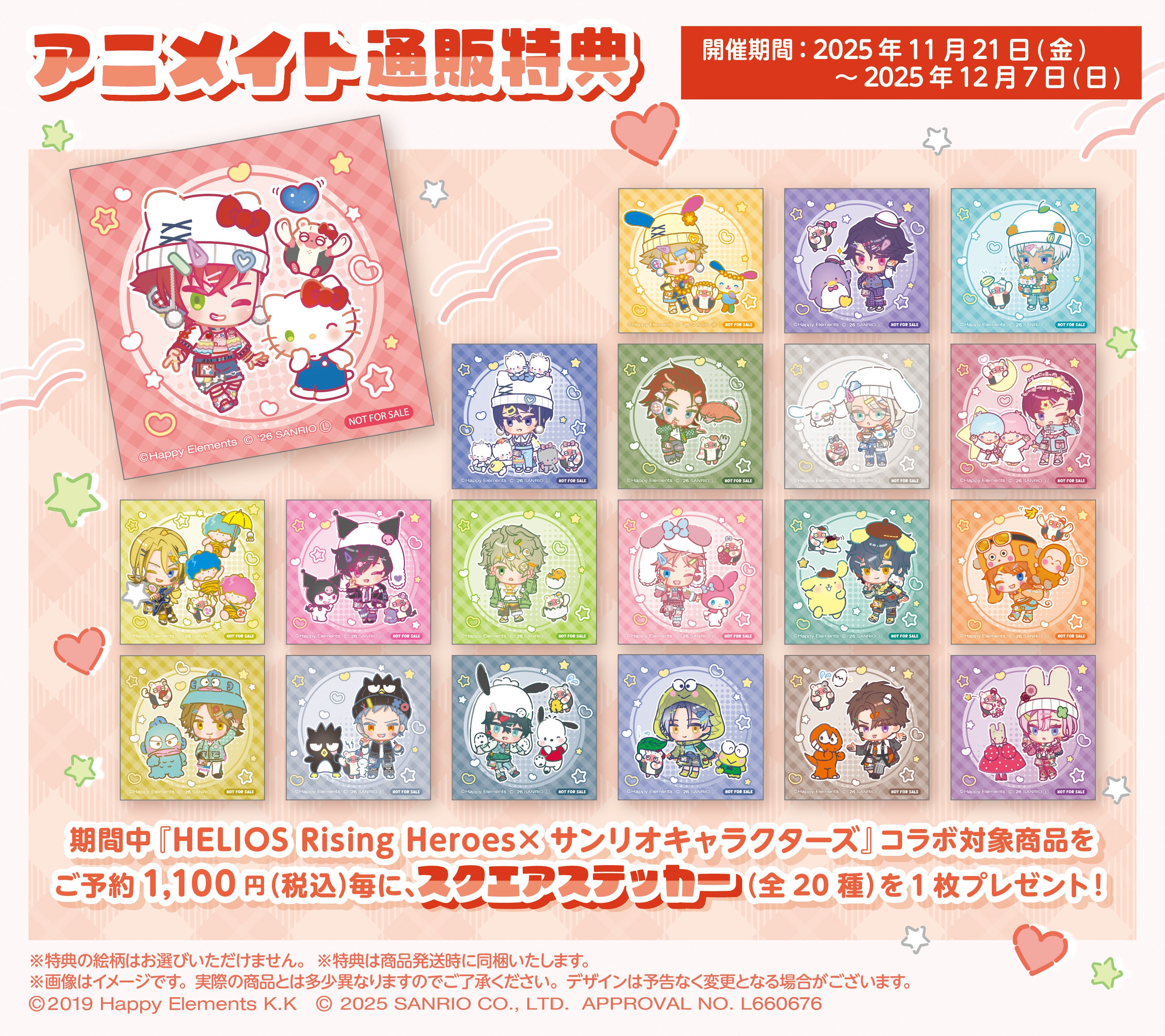期間中『HELIOS Rising Heroes×サンリオキャラクターズ』コラボ対象商品をご予約1,100円(税込)毎に、スクエアステッカー(全20種)を1枚プレゼント!