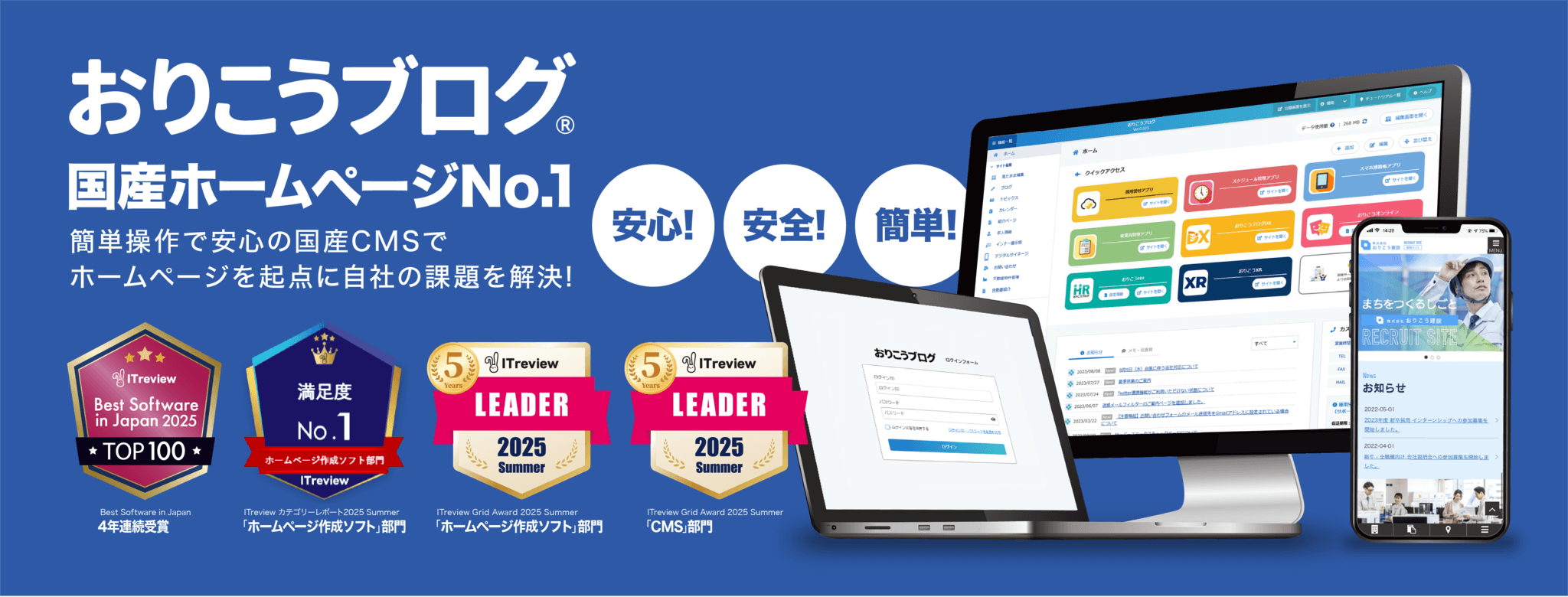 IT・Webに詳しくない方でも、簡単にWebサイトを作成・運用できるノーコードの国産CMSです。シンプルな操作性と手厚いカスタマーサポートが特長で、日本全国で2万件以上の導入実績があります。また、レビューサイト「ITreview」において、ホームページ作成ソフト部門で顧客満足度NO.1を獲得し、「Best Software in Japan 2025」TOP100にも選出されています。