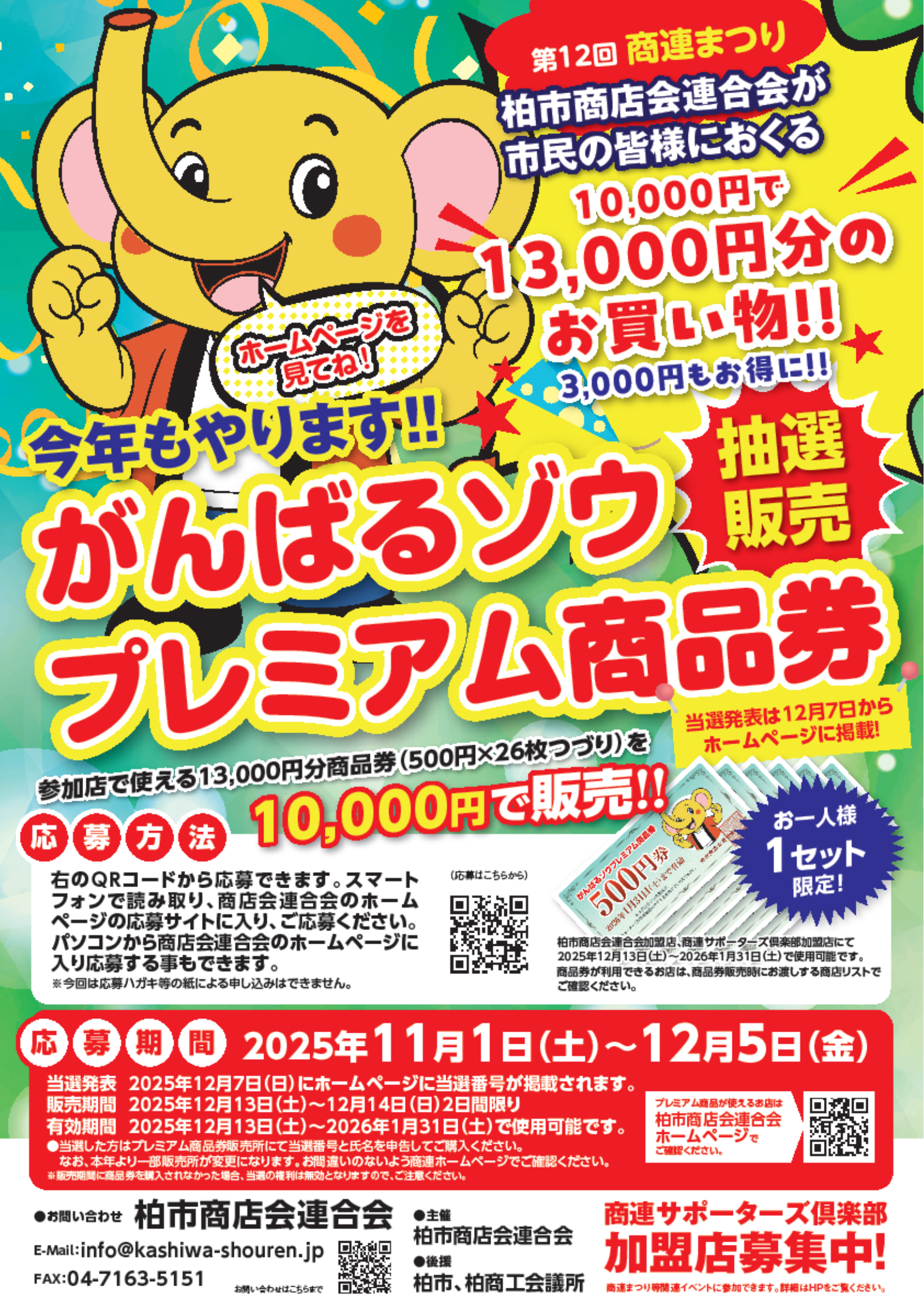 柏市商店会連合会にて、地域の商店や飲食店の利用促進を目的とした、「がんばるゾウプレミアム商品券」の申込受付を開始いたしました。本商品券は、1セット10,000円で購入でき、柏市商店会連合会の加盟店舗で13,000円分ご利用いただける(プレミアム率30%)お得な商品券です。地域に根ざした消費を後押しし、コロナ禍を経て、なお頑張る地元商店を応援する取り組みとして、これまで多くの市民の皆さまにご利用いただいてきました。今年もより多くの方に地元でのお買い物やお食事を楽しんでいただくことで、柏の街のにぎわいの創出を目指します。