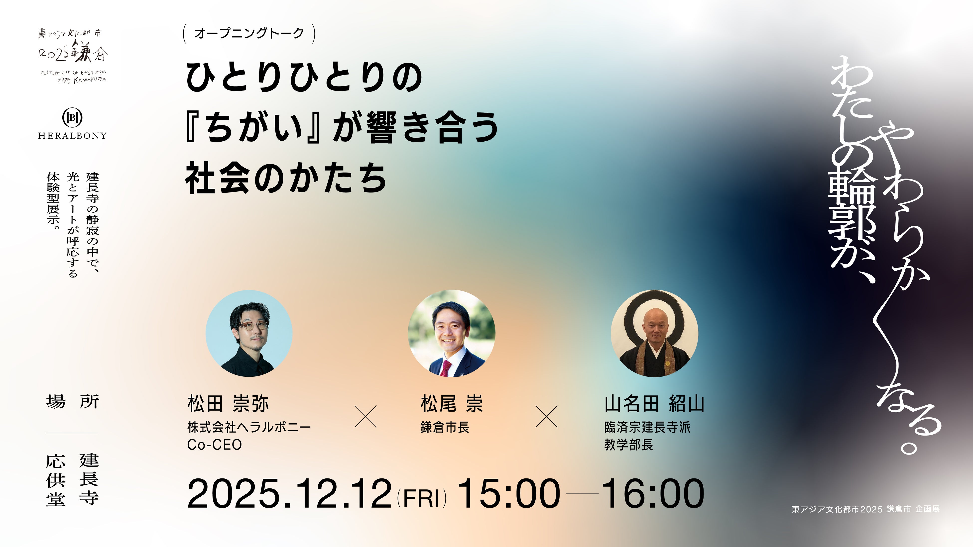 株式会社ヘラルボニー(以下、ヘラルボニー)は、ARu inc.(アル、以下ARu)と協働し、東アジア文化都市2025鎌倉市実行委員会が主催する企画展「わたしの輪郭が、やわらかくなる。」の企画・運営を担当いたします。本企画展は、12月12日(金)から12月16日(火)までの5日間催され、歴史的建造物である建長寺 応真閣を舞台に、作家たちの作品と光のインスタレーションが静かに交わり、来場者の感覚に寄り添う体験を創出します。