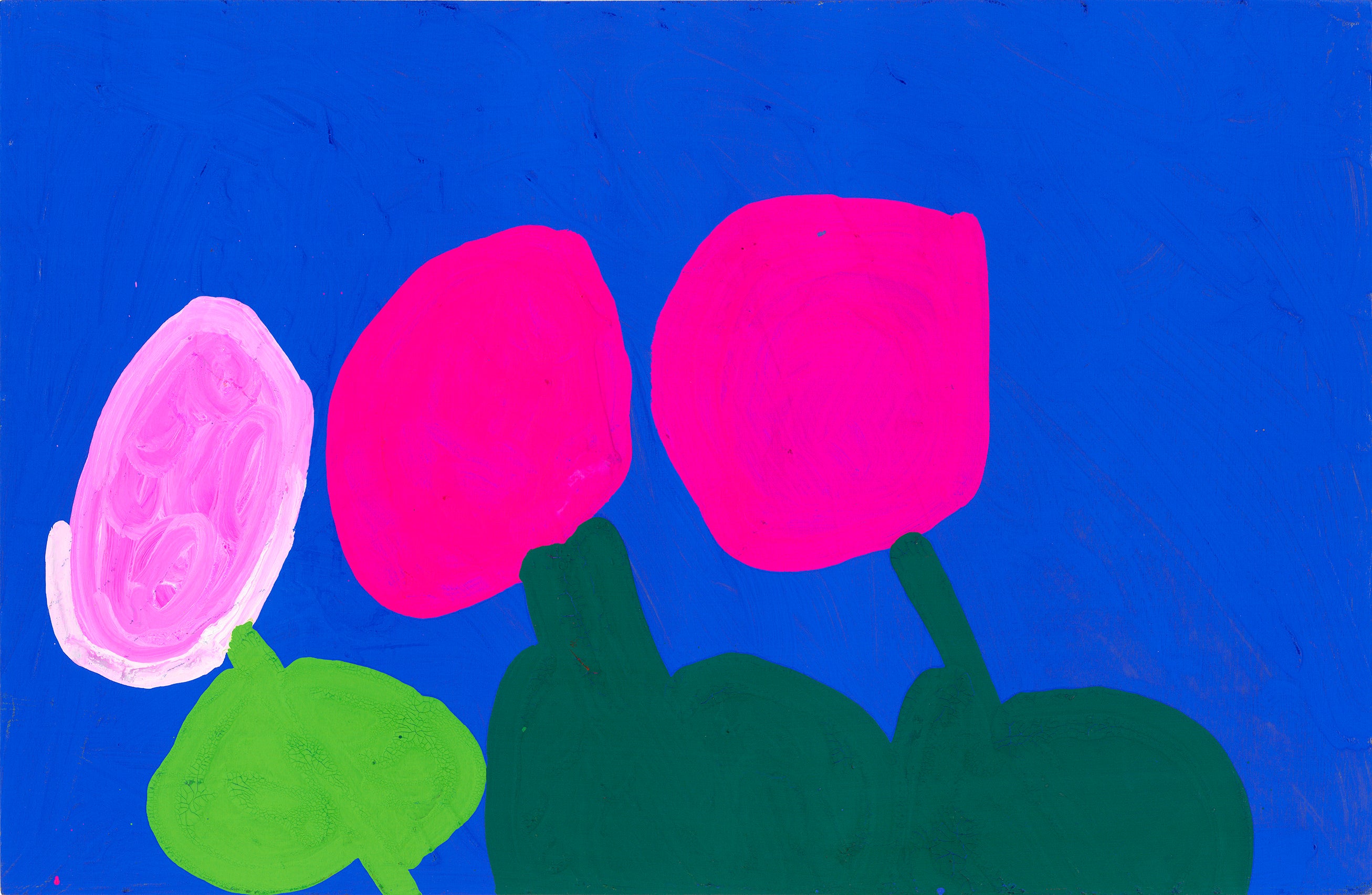 植物を見て描くというのが彼の制作スタイル。色や形を単純化して構成する画面の構成力も魅力である。太筆で描き進める作品は、愛らしく、見る人を優しい世界へ連れて行く。一方、マジックペンで大胆に表現されるオリジナルの「福井フォント」が使われた作品は凛然とした雰囲気を纏い、見るひとの目を惑わせる。
