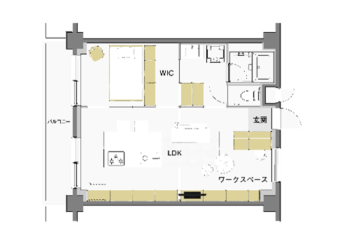 専用部(住戸)内は、住む人が引戸や無印良品の家具を用いて、暮らしや家族構成の変化に合わせて自由に空間を仕切ることが可能な、可変性の高いデザインを採用しています。