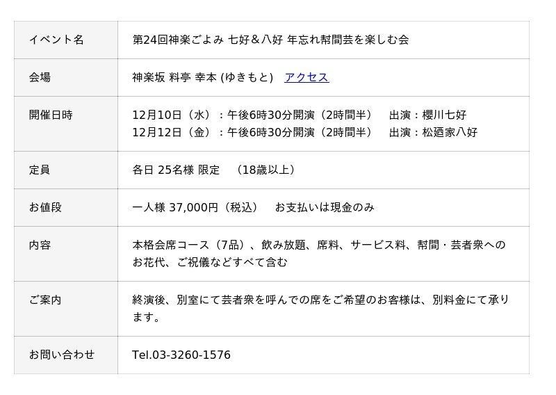 【神楽坂 幸本(ゆきもと)】年忘れの宴 第24回神楽ごよみ「七好&八好 年忘れ幇間芸を楽しむ会」開催のお知らせ 日本の伝統芸「幇間(太鼓持ち)芸」と、神楽坂芸者衆の華やかなおもてなしで一年を締めくくる