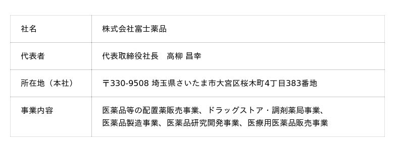 富士薬品は、1930年富山県富山市における配置薬販売業の創業からスタートし、現在では配置薬販売事業に加えて、ドラッグストア・調剤薬局事業、医薬品製造事業、医薬品研究開発事業、医療用医薬品販売事業を展開する複合型医薬品企業です。スローガン「とどけ、元気。つづけ、元気。」のもと、富士薬品グループ全体で日本全国に1,273店(2025年3月末時点)を展開する「セイムス」ブランドを中心としたドラッグストアと、全国に広がるラストワンマイルを埋める配置薬販売ネットワークを生かし、誰もが豊かな人生を送れる社会の実現に向けて、人々の暮らしのあらゆる場面で寄り添い、元気な生活を支え続けてまいります。株式会社富士薬品 会社概要 URL:https://www.fujiyakuhin.co.jp