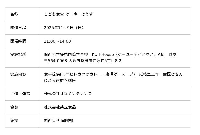 「ドーミー」の名称で全国約500棟以上の学生寮・社員寮を展開する株式会社共立メンテナンス(以下、共立メンテナンス/代表取締役社長:中村 幸治/本社:東京都千代田区)は、運営寮の関西大学(学長:高橋 智幸/場所:大阪府吹田市)の提携国際学生寮「KU I-House」にて、11月9日(日)に8回目の『こども食堂 けーゆーはうす』を開催いたしました。