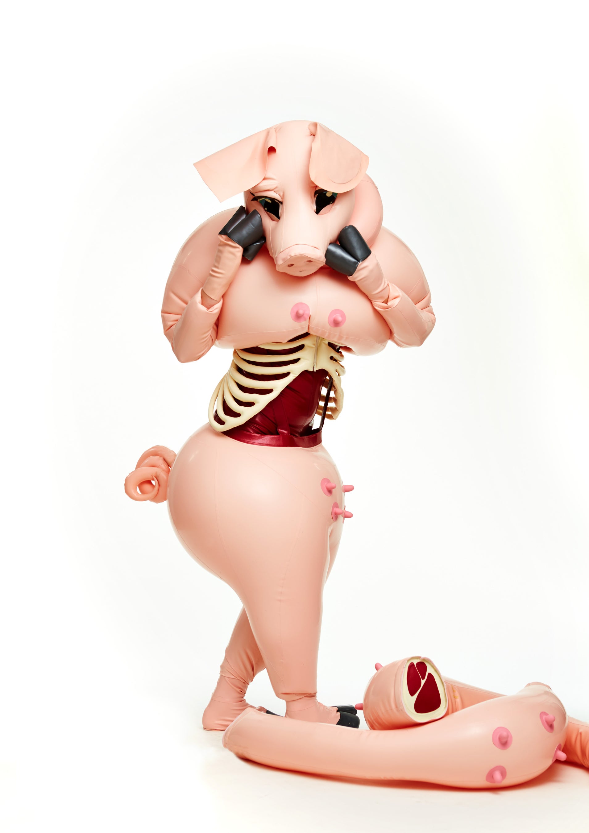 構成・演出・美術:サエボーグ Saeborg1981年富山生まれ、東京拠点。サエボーグは不完全なサイボーグ。ハーフヒューマン、ハーフトイ。自らの⽪膚の延長としてラテックス製のボディスーツを自作し、装着するパフォーマンスを展開するアーティスト。性別などの固定化されたアイデンティティや、人間の身体そのものを超越したいという強い願望を原動力に、家畜などを玩具的にデフォルメしたボディスーツに身を包み、生態系の最底辺の生き物たちが織り成す遊戯的なユートピア実験牧場を作り出す。