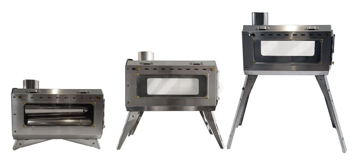 キャンキャンパーの「焚き薪ストーブ」は脚をペグで固定でき、砂利・雪・土などさまざまなサイトに対応します。
