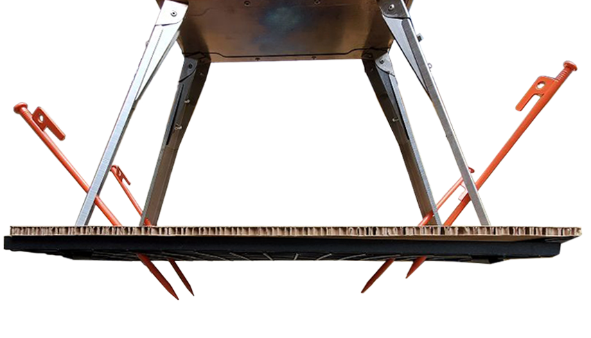 30cmペグの使用例。「焚き薪ストーブ」の脚にはペグ専用の穴を設け、しっかり固定できる独自設計。ガイロープ不要で組み立て簡単。