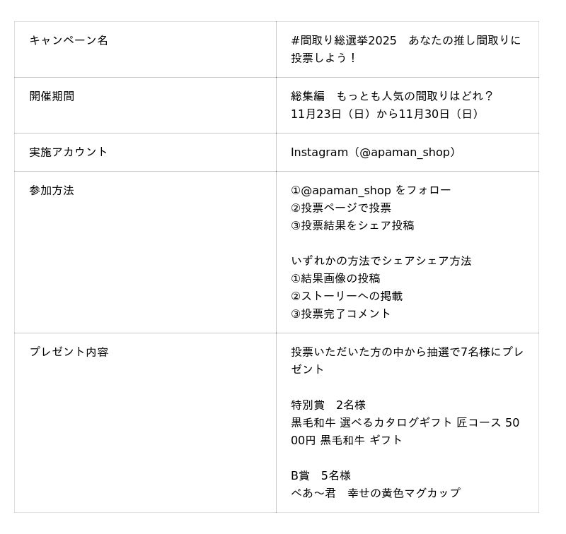 賃貸住宅仲介業において、店舗数*1 および契約数*2 ともに No.1 を誇る APAMAN株式会社(東京都中央区、代表取締役社長:山崎戒)は、公式Instagram(@apaman_shop)にて、フォロワー参加型キャンペーン「#間取り総選挙2025」 第4弾(最終回)あなたの推し間取りに投票しよう!を2025年11月23日(日)から11月30日(日)に開催いたします。
