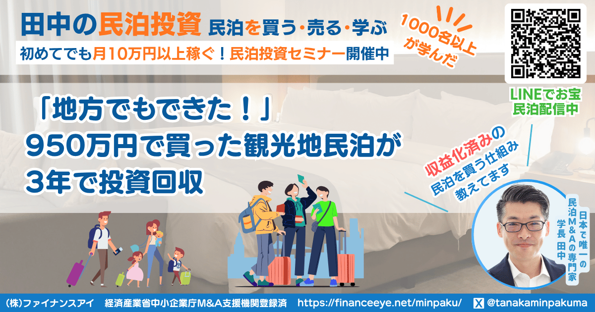 不動産価格の高騰や融資厳格化が続く中、“すでに収益が出ている民泊事業をM&Aで買う”という新しい投資手法が注目を集めています。株式会社ファイナンスアイ(田中の民泊投資)(本社:大阪市中央区、代表取締役:田中琢郎)は、民泊開業を考えている方・民泊を運営していて売却したい方・不動産投資や民泊投資を考えている方に向けて、『民泊投資をするなら稼働中・収益化済みの民泊を買う!民泊投資の専門家が少額資金から始める買い方・売り方を解説』と題したセミナー(オンラインZOOM/オフライン同時開催)を2025年12月6日(土)13:30に開催致します。