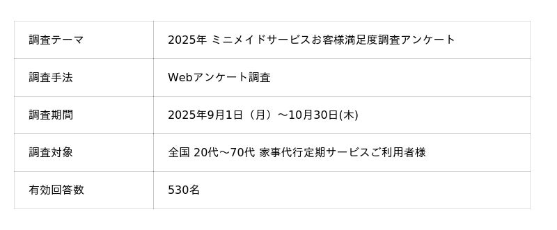 日本初の家事代行サービス提供会社として今年40周年を迎えたミニメイド・サービス株式会社(本社:東京都渋谷区 代表取締役:加藤貴身、以下:ミニメイドサービス)は、この度、全国のサービス利用者様を対象に実施した「2025年度お客様満足度調査アンケート」の結果を公開しました。