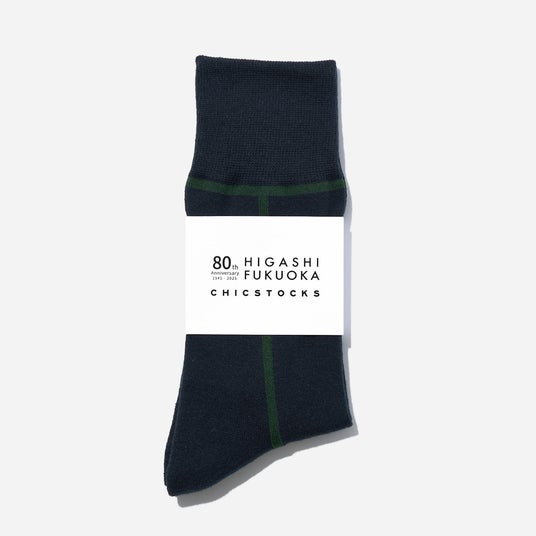 制服・私服にも馴染むデザインを追求CHICSTOCKSのブランド定番モデル「ライン」をベースに、サイドラインは制服のデザインにも入っているスクールカラーのモスグリーンを起用。在校生と教職員および記念式典の来賓の方への記念品とするために、靴下は制服やビジネスシーン、私服を問わず履きやすいよう落ち着いた色でまとめました。