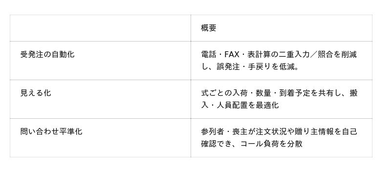 「FAXや電話での受注が減り、参列者がスマホで供花・供物を選んで入力できるので手戻りが激減。名前の漢字間違いも防げます。注文数も増え、訃報ページの閲覧数を目安に参列規模を見立て、返礼品や人員配置を前倒しで準備できるようになりました。お客様にも“簡単で楽”と好評です。」■導入効果――スマート葬儀で稼働中