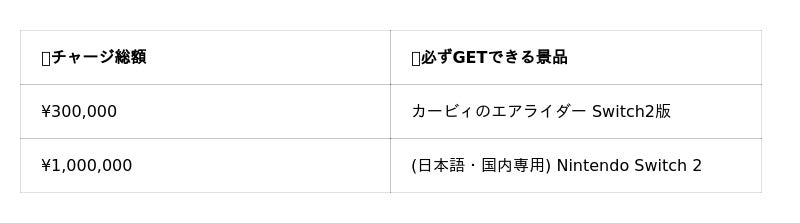 例:期間中100万円チャージした場合、上記の「カービィのエアライダー Switch2版」と「Nintendo Switch 2」の両方をプレゼントいたします。