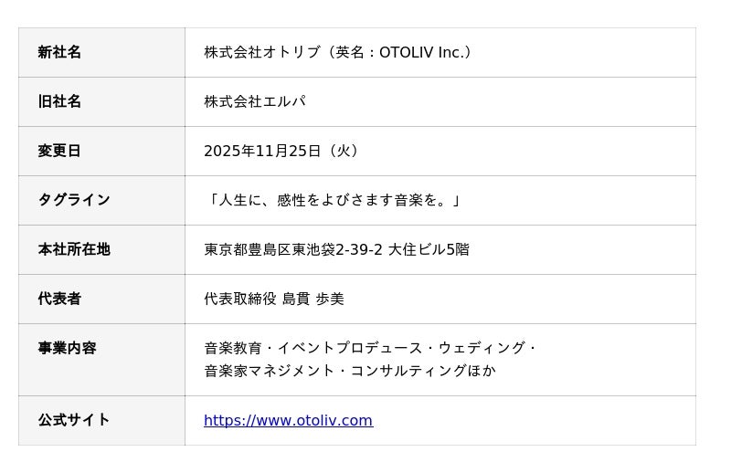 株式会社エルパ(本社:東京都豊島区、代表取締役:島貫歩美)は、創立25周年を迎える節目の年となる2025年11月25日付で、社名を「株式会社オトリブ(OTOLIV Inc.)」へ変更いたします。