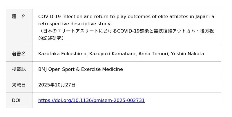 COVID-19はアスリートの運動パフォーマンスに大きな影響を与え、急性期症状以外に慢性的な運動時症状を及ぼしパフォーマンス低下がみられることがあり、心理的ストレスが原因でメンタルヘルス障害につながることもあります。特にエリートアスリートは大会出場のための検査実施や国際移動が必要となり、一般人口とは異なる暴露に曝され、感染状況や安全な競技復帰までの期間が異なる可能性があります。その一方で、競技復帰基準は専門家の意見に依存し、データに基づく根拠が十分ではありません。日本のエリートアスリートにおける感染の頻度・分布と競技復帰の実態を明らかにすることが必要と考え、今回の検討を行いました。【研究内容と成果】