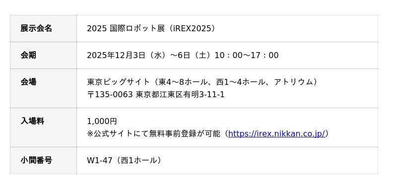 2025年12月3日(水)~6日(土)に東京ビッグサイトで開催される「2025国際ロボット展(iREX2025)」に出展する。