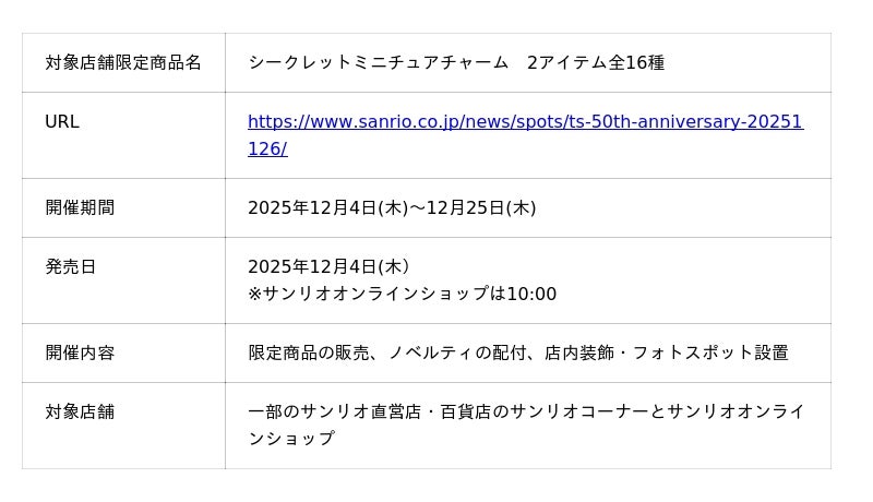 さらに、一部のサンリオショップでは、50周年をお祝いする装飾・フォトスポットの設置をはじめ、限定商品の発売、数量限定購入特典のノベルティ配付を実施いたします。ぜひ、この機会にお立ち寄りください。