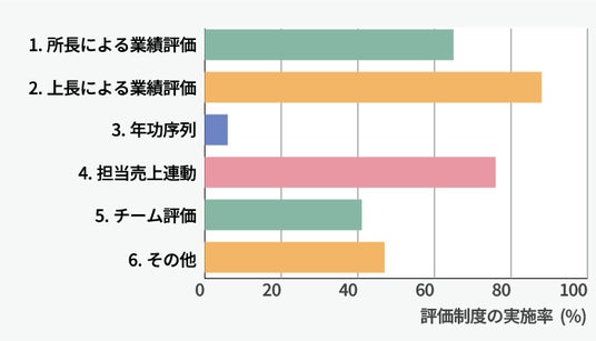 昇給、昇格のためにどのような評価制度があるかを分析したところ、17社から回答が得られ、88%が「上長による業績評価」となり最も多い回答となりました。その他には「担当売上連動」「所長による業績評価」という回答も多く、単一基準での評価ではなく、複数の評価の組み合わせが一般的であることが伺えます。一方で「年功序列」という回答は6%と少なく、基本的に実力主義と言えます。