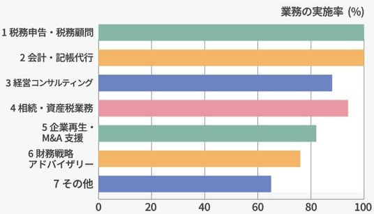 業務内容では、8~9割の会計事務所が経営コンサルティング、企業再生・M&A支援にも対応しており、従来の会計・税務にとどまらず幅広い領域へと業務がシフトしている。