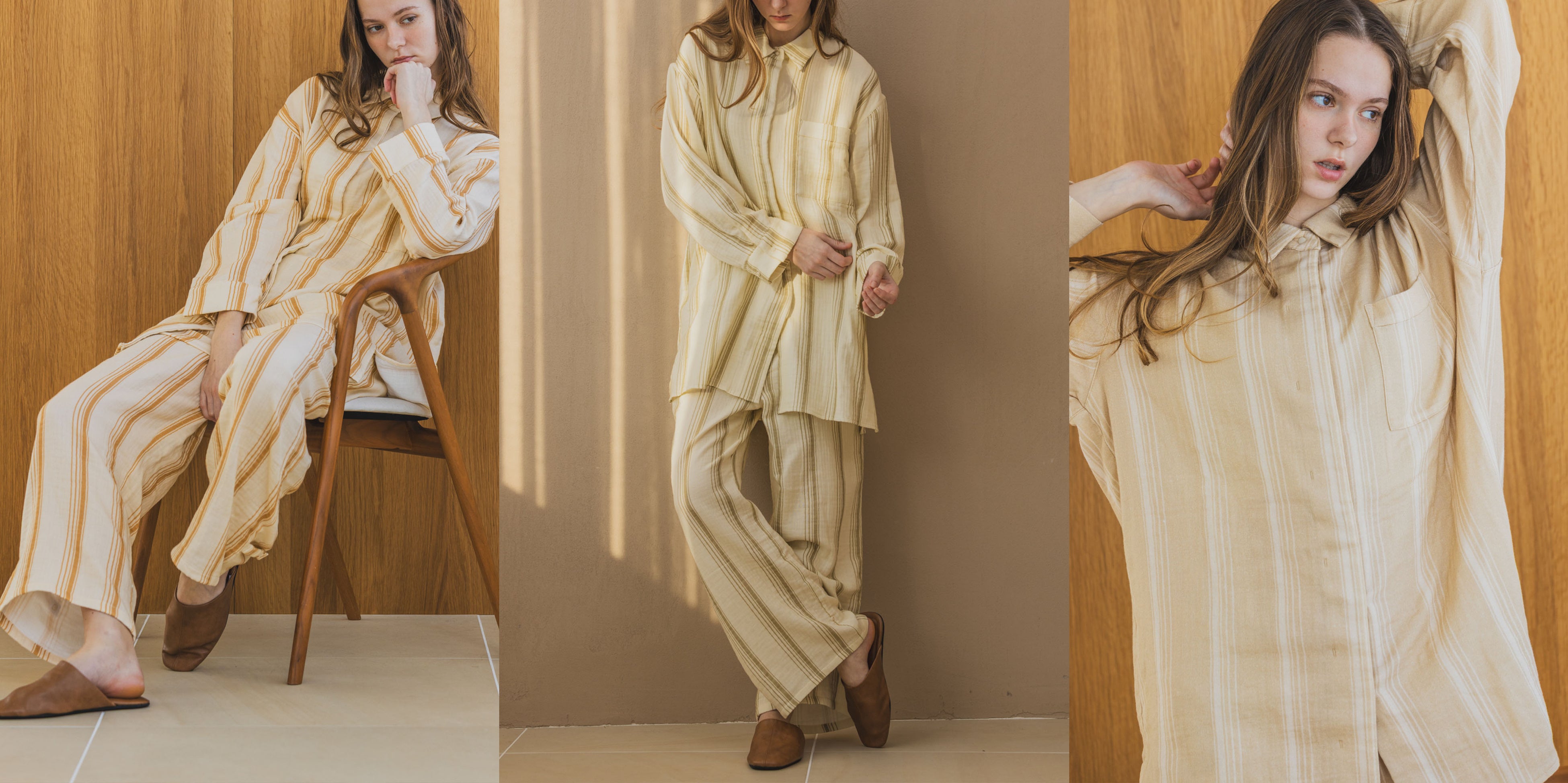 Triple Gauze Nightwear Stripe 19,800円(税込) / Color : 左からCamel, Green, Ecru