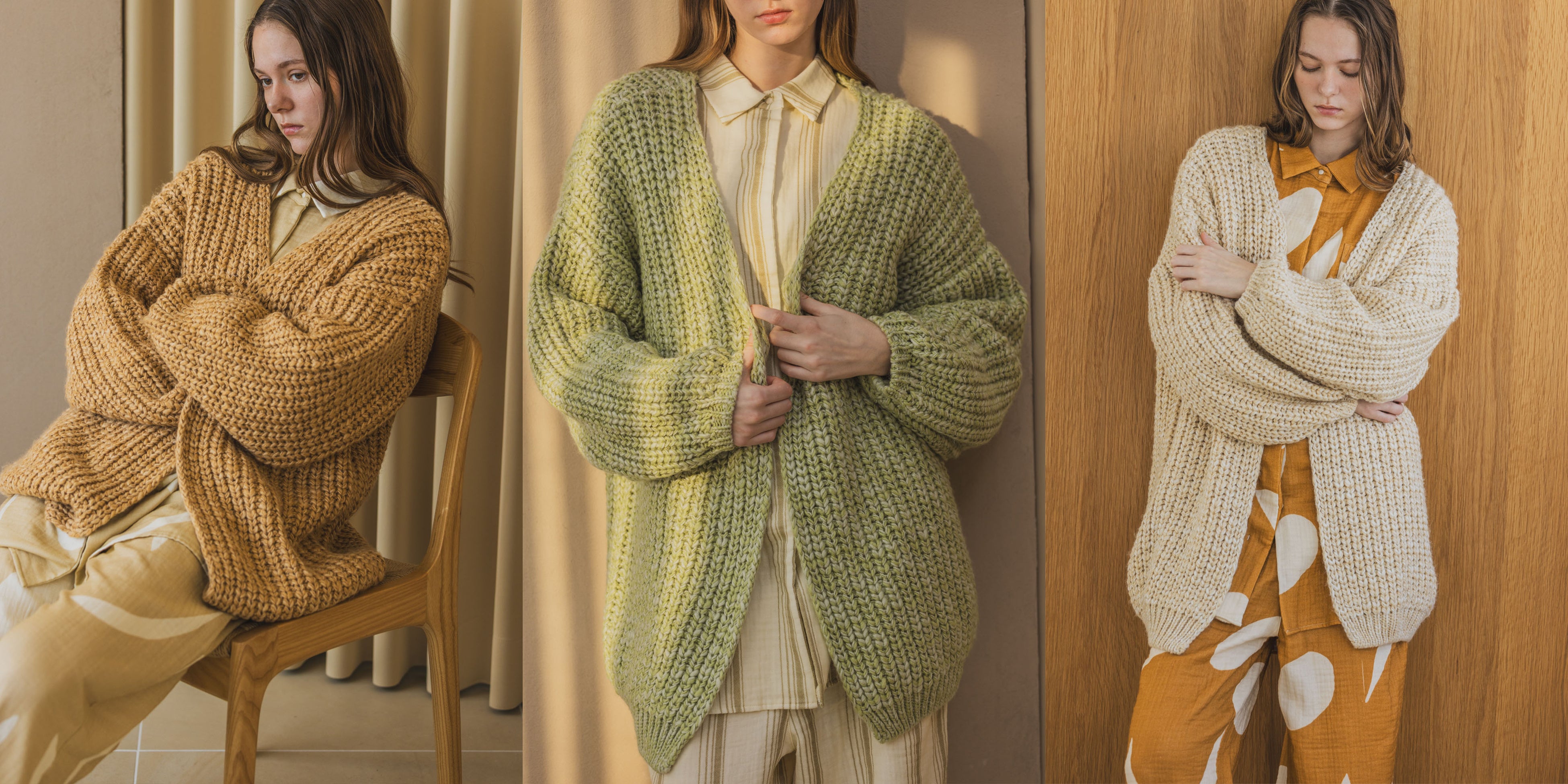 Mix Color Knit Cardigan 21,800円(税込) / Color : 左からCamel, Green, Ecru