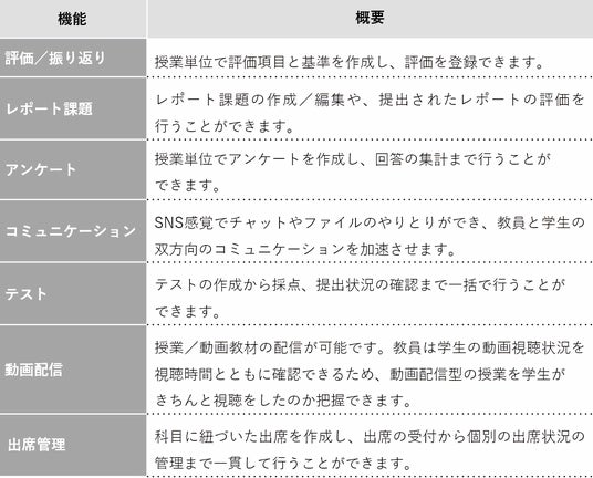 また、授業前の資料配布や講義動画の配信、出欠確認、グループワーク、授業後のレポートやテストなど、教員と学生の間のコミュニケーションを円滑にサポートします。
