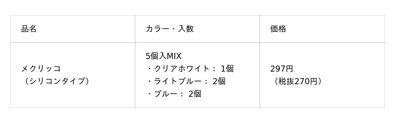 従来品はオレンジやピンクといったカラーミックスでしたが、新たな「メクリッコ(シリコンタイプ)」はクリアホワイト・ライトブルー・ブルーのブルー系グラデーションミックス。カラーの楽しさはそのままに、男女ともに選びやすいカラーリングになりました。