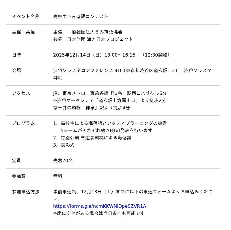 一般社団法人うみ落語協会は、2025年12月14日(日)、東京・渋谷の「渋谷ソラスタコンファレンス」にて「高校生うみ落語コンテスト」 を開催します。本コンテストでは、海洋問題を楽しく、そして分かりやすく伝える「海の落語プロジェクト」に挑戦した10人の高校生が登場。プロの落語家の指導のもと創作・稽古を重ねた「海落語」と、環境科学者の指導のもと実施した調査・研究による「アクティブラーニング」の成果を披露するため、半年間にわたるプログラムの集大成としてステージに臨みます。高校生たちの熱演と学びの成果を、ぜひ会場でお楽しみください。
