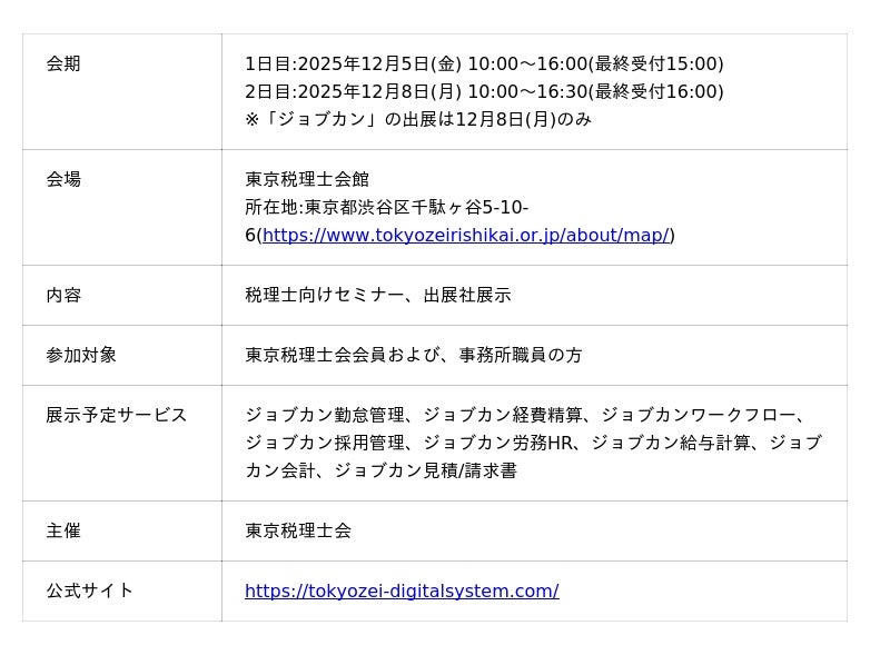 株式会社DONUTS(東京都渋谷区、代表取締役:西村啓成)が提供するバックオフィス支援クラウドERPシステム「ジョブカン」は、2025年12月5日(金)・8日(月)に東京税理士会館(東京都渋谷区)で開催される会計事務所・税理士向け展示会「デジタルフォーラム2025」の2日目に出展します。