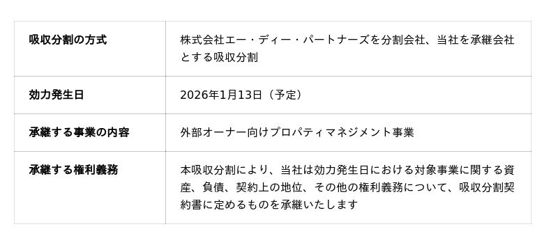 当社は、アパート開発およびプロパティマネジメント事業を主軸として事業を展開しており、不動産オーナー様への総合的なサポート体制の構築を経営の重要課題としております。今回承継する「外部オーナー向けプロパティマネジメント事業」は、エー・ディー・パートナーズが長年にわたり培ってきた管理ノウハウと顧客基盤を有する事業であり、当社グループの事業領域拡大と収益基盤の強化に資するものと判断いたしました。2. 本吸収分割の概要