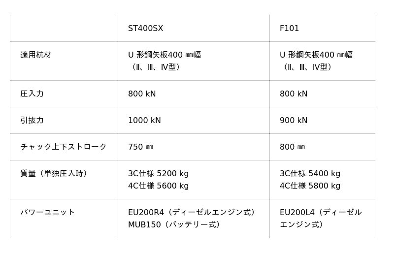 U形鋼⽮板400 mm幅対応機です。現行機の「サイレントパイラー(TM) F101」より200kg軽量化し、引抜力も100kN向上するなど、現場での機動性と対応力が進化しています。圧入から引抜に瞬時に転じる高い応答性も備え、打抜サイクル時間(一本の杭を圧入するための圧入・引抜動作の所要時間)が約37%短縮※3。さらに、バッテリー式電動パワーユニットにも対応しており、CO2排出ゼロの圧入施工を可能にします。