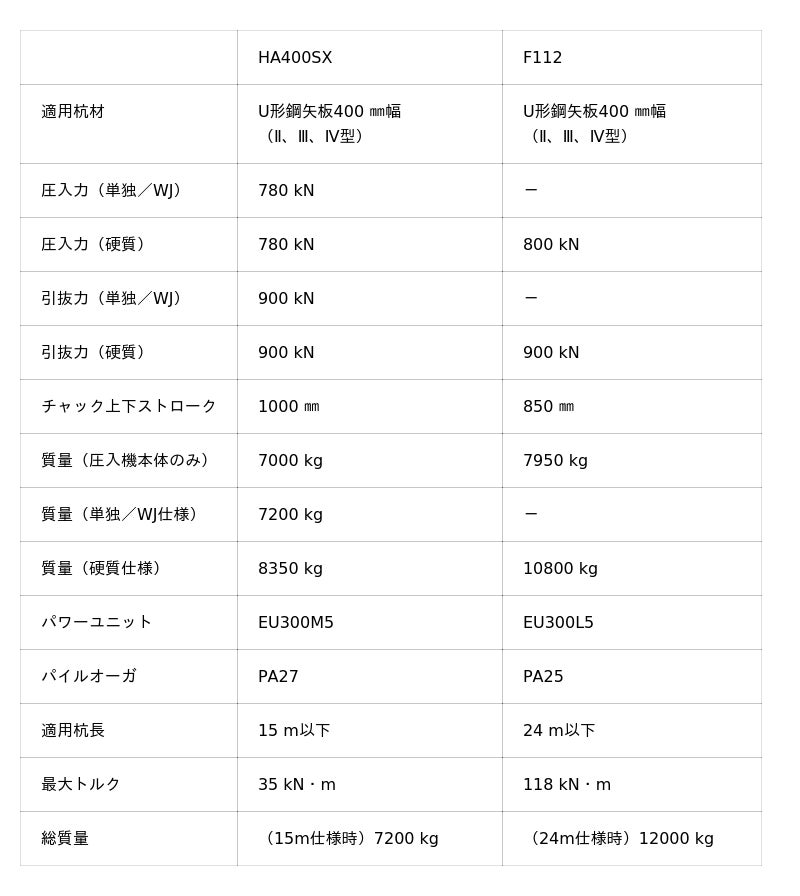 1台の機械で「単独圧入」、「ウォータージェット併用圧入」、「硬質地盤圧入」の3種類の工法が選択できる、複合式の U形鋼⽮板400 mm幅対応機です。特に需要の高いN値(地盤の硬さ)50~250程度の砂礫層・玉石層等に最適な軽量・コンパクトな機械となっており、N値250~600程度の地盤をターゲットとした「サイレントパイラー(TM) F112」より2450kg軽量化。高い機動性を実現しています。