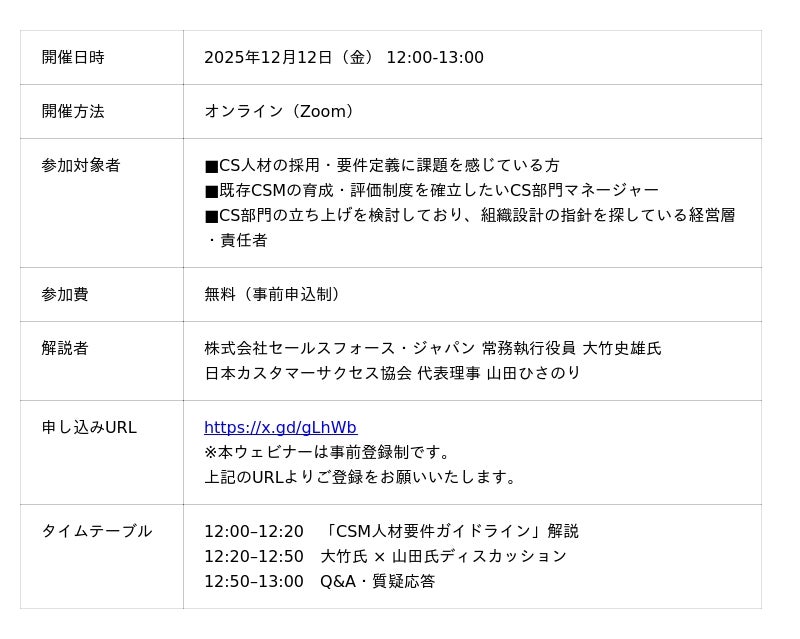 一般社団法人日本カスタマーサクセス協会(所在地:東京都中央区、代表理事:山田 ひさのり 以下 当協会)は、CS(カスタマーサクセス、以下CS)業務に従事する人材の要件を体系的に整理することを目的に、「CSM(CSマネージャー)の人材要件」を公開しました。本資料の公開を記念し、12月12日(金)に当協会代表理事の山田ひさのりと株式会社セールスフォース・ジャパン 常務執行役員の大竹史雄氏による解説ウェビナーを開催いたします。
