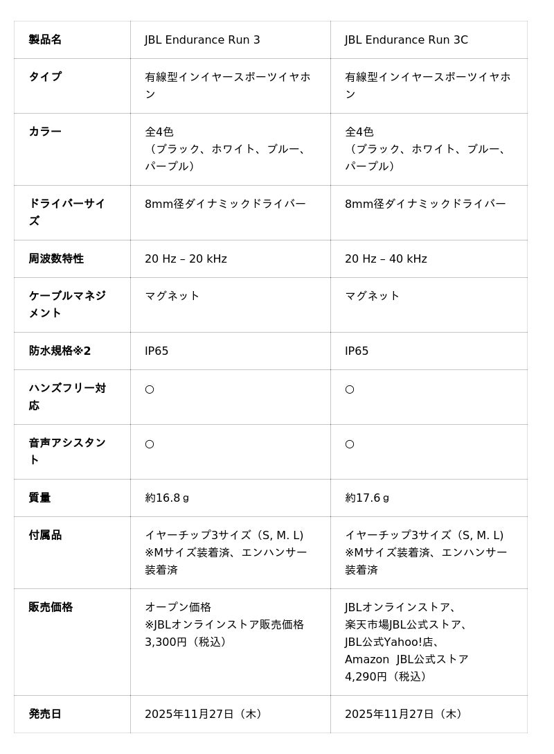 ハーマンインターナショナル株式会社(本社:東京都千代田区、代表取締役:桑原拓磨)は、アメリカ カリフォルニア発祥の世界最大級のオーディオブランドであり、日本においてワイヤレススピーカー7年連続販売台数No.1※1に輝く「JBL」より、激しい動きでも外れにくく、防塵防水IP65規格※2に対応した有線型インイヤースポーツイヤホン「JBL Endurance Run 3(エンデュランス ラン 3)」を2025年11月27日(木)より発売いたします。また、同日USB Type-Cの「Endurance Run 3C(エンデュランス ラン 3シー)」をJBLオンラインストア、楽天市場JBL公式ストア、JBL公式Yahoo!店およびAmazon JBL公式ストアにて限定発売いたします。
